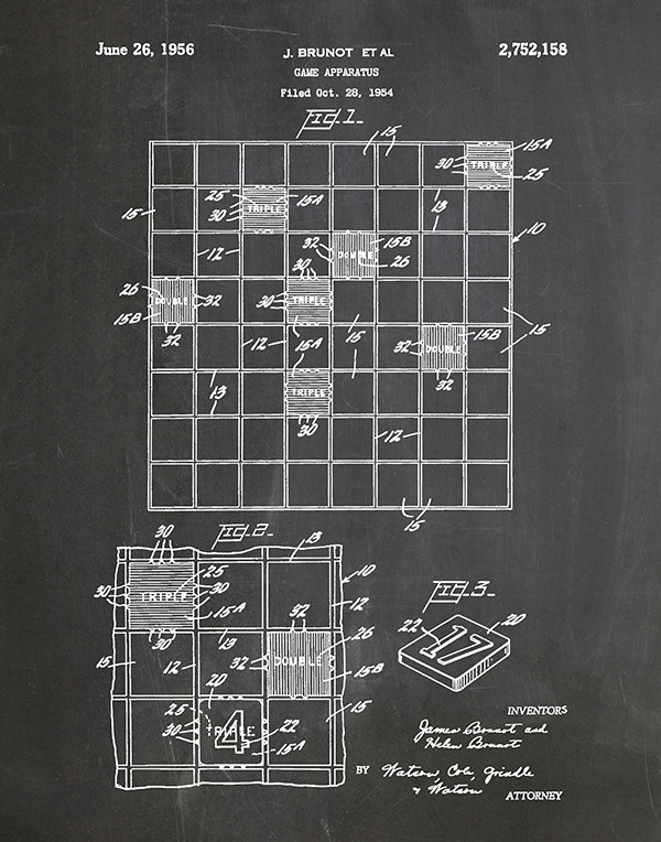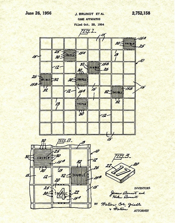 1956 Scrabble Game Patent Game Apparatus invented by James and Helen Brunot. The United States Patent and Trademark office issued the patent on June 26, 1956.