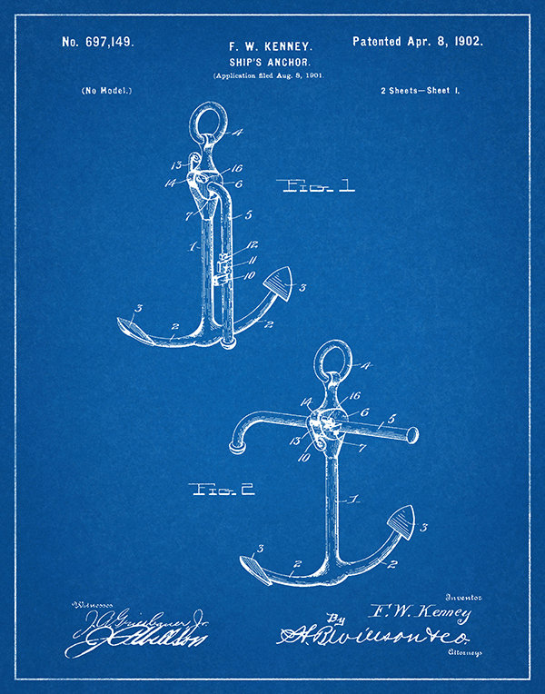 1902 Ship's Anchor Patent invented by Francis Kenney of Providence, RI. The patent was issued by the United States Patent Office on April 8, 1902.