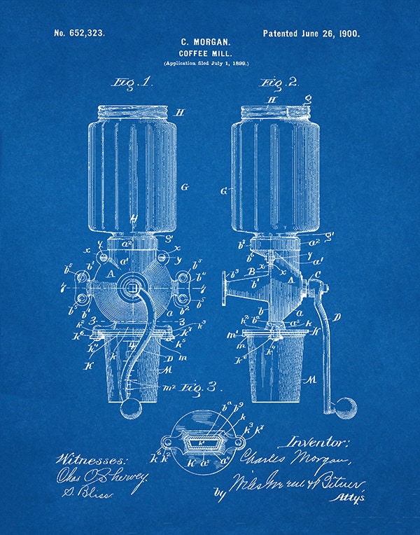 1900 Coffee Mill Arcade Crystal Coffee Grinder Patent designed by Charles Morgan. The patent was issued by the United States Patent Office on June 26, 1900.